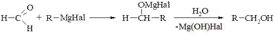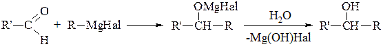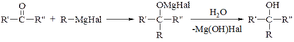 (третинні спирти відновленням добути неможливо). 5. Синтези за допомогою металоорганічних сполук (застосування реактивів Гріньяра). Ці сполуки легко приєднуються до полярних кратних зв’язків таким чином, що алкіл приєднується до атома Карбону, а інша частина – до атома Оксигену: