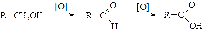 4. Окиснення спиртів – залежно від будови спирту та застосованого окисника (KMnO4, K2Сr2O7, CrO3 або О2 у присутності міді) спирти окиснюються до альдегідів, кетонів або карбонових кислот. Первинні спирти утворюють альдегіди, які далі окиснюються до відповідних кислот: