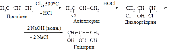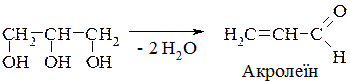 3. Дегідратація гліцерину в присутності водовіднімних засобів (KHSO4, MgSO4, H3BO3) або сульфатної кислоти приводить до утворення акролеїну: