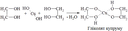 Найбільший інтерес становлять специфічні реакції багатоатомних спиртів, зумовлені наявністю в молекулі кількох –ОН груп, їх взаємним впливом та взаємодією. 1. Багатоатомні спирти з α-розміщеними гідроксильними групами здатні реагувати з гідроксидами важких металів з утворенням комплексних сполук: