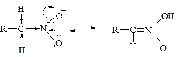Завдяки цьому первинні і вторинні нітросполуки розчиняються в лугах з утворенням солей. Треба мати на увазі, що це солі не власне нітросполук, а ізомерних їм ізонітросполук, так званих аци -нітроформ. Аци -нітроформи виявляють сильно виражені кислотні властивості: