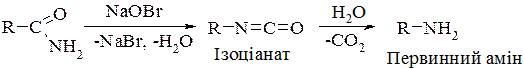 Одержану в результаті реакції Гофмана суміш амінів і четвертинної амонійної солі розділяють фракційною перегонкою або іншими методами. 2. Добування первинних амінів з амідів кислот (перегрупування Гофмана) відбувається за сумарною схемою: