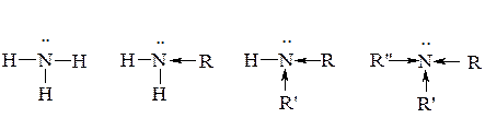 22.2.6. Хімічні властивості 1. Кислотно-основні властивості амінів. Основні властивості амінів пояснюються нуклеофільним характером атома Нітрогену, що має неподілену пару електронів, за рахунок якої він здатний приєднувати протон. Порівняно з амоніаком аліфатичні аміни мають більш сильно виявлені основні властивості. У разі переходу від первинного до третинного аміну електронна густина на атомі Нітрогену закономірно зростає під впливом оточуючих алкільних груп