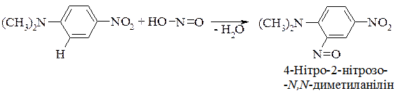 В. Третинні аліфатичні аміни з нітритною кислотою утворюють лише нестійкі солі, що розщеплюються під час нагрівання з утворенням складної суміші речовин, у тім числі оксосполук. У третинних ароматичних амінів вароматичному кільці молекул відбувається звичайне електрофільне заміщення Гідрогену на нітрозогрупу, яка спрямовується аміногрупою переважно в пара -положення, а якщо воно зайняте –в орто -положення: