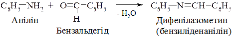 Ароматичні аміни, крім зазначених реакцій, можуть вступати також у реакції, характерні для ароматичного кільця; 5. Взаємодія з альдегідами – утворення шиффових основ (основ Шиффа, азометинів) відбувається при слабкому нагріванні: