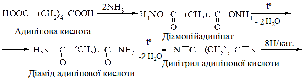 22.2.7. Окремі представники Моноаміни аліфатичного ряду використовуються в синтезі фармацевтичних препаратів і барвників. Етиламін також має застосування як компонент ракетного палива. Гексаметилендіамін (1,6-діаміногексан) має найбільше практичне значення серед діамінів. Його синтезують з адипінової кислоти за схемою: