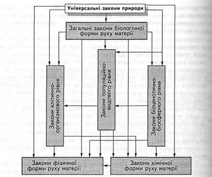 не притаманні. В живих системах відбувається ієрархічний контроль, що здійснюється через прямі (знизу вгору) та зворотні (згори вниз) зв'язки. Контролювальний вплив вищої системи на нижчу є однією з характерних особливостей світотворення. У контексті єволеоції біосфери розглядається проблема ноосфери, яка на нинішньому етапі розвитку науки трактується як результат синтезу наукової думки та соціальних відносин, що сприяють максимальному розкриттю творчих сил і здібностей людини. Ноогенез характеризується нагромадженням знань, думок, сукупністю ідеальних явищ, властивих людині та суспільству. Розум, за В. І. Вернадським, є глибоким проявом життя, а ноосфера — це сфера розуму. Із цього випливає висновок, що без розкриття поняття «ноосфера» знання про живу природу будуть неповними. Це поняття доцільно тлумачити через розкриття прямих та зворотних зв'язків між біосферою та ноосферою. Біосфера розглядається як субстрат, на основі якого утворилася ноосфера, й висвітлюється вплив останньої на біосферу загалом та її складові елементи (вид, популяція, організм, клітина). ■ Субординація біологічних систем проявляється у співвідношенні законів, що діють на різних рівнях організації життя: загальний напрям дії законів системи певного рівня врешті визначається загальнішими законами системи вищого рівня. У біологічних системах діють закони фізичної та хімічної форм руху матерії, але спрямовуються вони біологічними законами, тобто живі системи функціонують за законами фізики й хімії, які, однак, проявляються в діалектично «знятому» вигляді. Разом із тим функціонування біологічних систем спрямовується впливами систем вищого порядку (біосфера впливає на екосистему, екосистема — на вид, вид — на організм) і дією універсальних, загальних законів розвитку природи (рис. 5.2): збереження (речовини, енергії, інформації), спрямованості самочинних процесів, періодичності або ритму, полярності (все має альтернативу), динамічної рівноваги, причинності. Зі схеми рис. 5.2 видно, що універсальні закони природи проявляють свою дію в усіх формах руху матерії. Загальні закони життя поширюються на всі рівні його організації (клітинно-організмовий, популяційно-видовий, екосистемний). На сучасному етапі розвитку науки вже досліджено спрямовувальний уплив законів організмового рівня на особливості перебігу хімічних процесів у відповідній системі, приміром, у людському організмі. Тому до змісту програмного матеріалу шкільного курсу «Біологія» включено інформацію, яка розкриває дію законів фізичної та хімічної форм руху матерії на біологічному рівні, власні закони функціонування певних живих систем та універсальні закони розвитку природи.