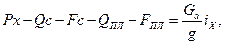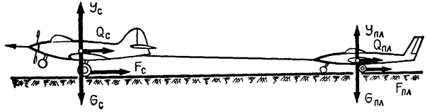где Ga=Gc+GПЛ - суммарный вес аэропоезда; Fс, Fпл - сила трения колес самолета и планера о землю; Qс, Qпл - лобовое сопротивление самолета и планера; Рх - тяга, развиваемая двигательной установкой самолета-буксировщика