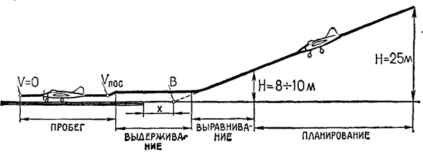 Посадка является завершающим этапом полёта и представляет собой замедленное движение самолета с высоты 25 м до полной остановки после пробега по земле. Посадка самолета, как правило, состоит из следующих этапов (рис. 9): - планирования (снижения); - выравнивания; - выдерживания; - приземления (парашютирования); - пробега.