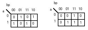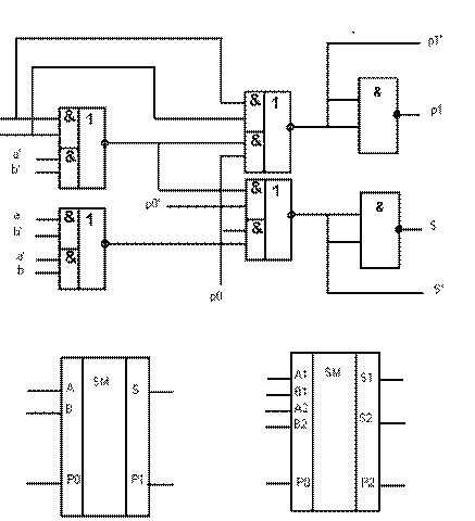 Имеем систему полностью определённых булевых функций. Производим раздельную минимизацию (см. рисунок). Si = ai'вi'Pi-1 + ai'вiPi-1' + aiвi'Pi-1' + aiвiPi-1 = = Pi-1(ai~вi) + Pi-1'(aiÅ вi) = Pi = вiPi-1 + aiPi-1 + aiвi
