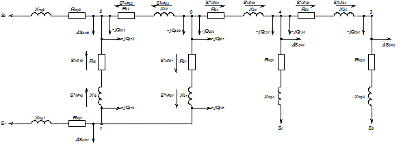 После определения расчетных нагрузок схема замещения сети примет вид, представленный на рисунке 13.4 Расставляются направления потоков мощности в начале и в конце участков сети.