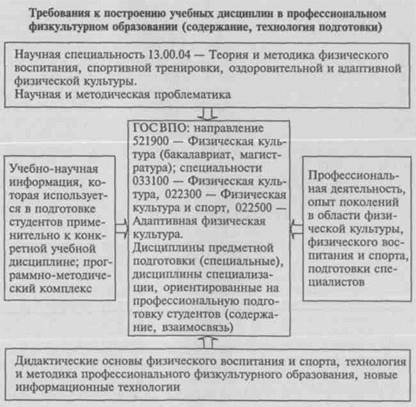 ражение в учебных дисциплинах высшего профессионального физкультурного образования: «Теория и методика физического воспитания и спорта»; «Основы научно-методической деятельности в физической культуре и спорте»; «Педагогическое физкультур-но-спортивное совершенствование»; «Спортивно-педагогические дисциплины»; «Медико-биологические дисциплины». На основе этих и других входящих в учебный план дисциплин, их интеграции строится и осуществляется учебная деятельность на факультете физической культуры и спорта или в физкультурном вузе, профессиональная подготовка будущих специалистов по физической культуре и спорту. К окончанию высшего учебного заведения выпускники должны иметь высокий уровень профессиональной готовности, важнейшим компонентом которой должны быть навыки научно-методической работы [13, 19, 20, 23, 24]. Формирование и построение учебных дисциплин учебного плана Государственного образовательного стандарта высшего профессионального физкультурного образования подчиняются определенным требованиям (см. схему 2). Первое — наличие информа-. Схема 2