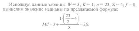 Медиана (Md) — это такое значение, которое делит упорядоченное множество пополам так, что одна половина значений оказывается больше медианы, а другая — меньше. Определение медианы возможно лишь в том случае, когда измерения выполнены не ниже шкалы порядка. Способы вычисления медианы могут быть следующие. 1. Если данные содержат нечетное число различных значений и они представляют упорядоченный ряд, то медианой является среднее значение ряда. Например, в ряду 5, 8, Ц, 25, 30 медиана равна 12. 2. Если данные содержат четное число различных значений, упорядоченных в ряд, например 3, 8, 16, 17, то медианой являет-