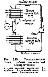 Приведенные показатели свидетельствуют о большой стоимости «энергии будущего». В самом деле, если считать, что электроэнергия, полученная на основе нефти, угля или урана, стоит в среднем 3—б центов за 1 кВт-ч, то энергия вертикальных термоградиентов и океанских ветров будет в 1,5—2 раза дороже. Остальные виды энергии будут дороже в 4—6 раз. Из указанных возможных энергий океана пока наиболее ясно использование вертикальных термоградиентов. На рис. 3.15 показана работа так называемой «закрытой» системы. Насос обеспечивает циркуляцию аммиака, имеющего очень низкую температуру кипения, в замкнутом контуре. Теплая океаническая вода нагревает аммиак (верхняя часть схемы), который переходит