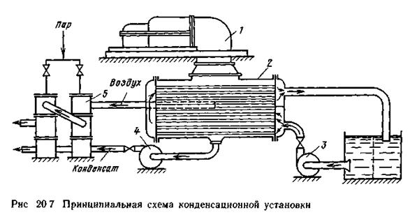 Конденсационная установка предназначена для создания за паровой турбиной 1(рис. 20.7) разрежения (вакуума) с целью увеличения используемого теплоперепада и повышения термического КПД паротурбинной установки. В конденсационную установку входят конденсатор 2, циркуляционный 3 и конденсатный 4 насосы, а также устройство для отсасывания воздуха из конденсатора 5 (обычно это паровой эжектор). Отработавший пар поступает в конденсатор сверху. Соприкасаясь с поверхностью трубок, внутри которых протекает охлаждающая вода, пар конденсируется. Конденсат стекает вниз и из сборника конденсационным насосом подается в поверхностные холодильники парового эжектора, а оттуда через систему регенеративных подогревателей поступает в паровой котел.