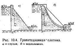Плотины, перегораживая русла реки, предназначены для создания водохранилища и тем самым являются главнейшим сооружением гидроузла для создания напора и регулирования стока. Все плотины делятся, на две основные группы, отличающиеся друг от друга используемым материалом: плотины бетонные и железобетонные и плотины грунтовые (земляные, каменно-набросные и каменно-земляные). Бетонные и железобетонные плотины по конструктивным признакам делятся на гравитационные, арочные и контрфорсные. Отличительным признаком гравитационных плотин является их массивность (рис. 10.4). Большая масса их и силы сцепления (трения) по основанию позволяют воздвигать такого рода плотины на любых грунтах. Считается, что при высоте до 30—40 м гравитационная плотина может быть сооружена на слабом основании (песок, глина), а на скальном основании высота ее может достигать 300 м. По возможности пропуска воды такие плотины могут быть глухими (рис. 10.4,а), т. е. не допускающими перелива воды через свой гребень, и водосливными (рис. 10.4,6). Последние выполняются с поверхностными (водосливными) или заглубленными (донными) отверстиями для пропуска воды. Плотины русловых ГЭС состоят обычно из глухой и водосливной части. Высокие плотины в узких ущельях часто строятся глухими. В этом случае сброс излишней воды осуществляется в обход плотины по поверхностному или туннельному водосбросу. В теле бетонных плотин обычно устраиваются продольные галереи (патерны), предназначенные для контроля фильтрации воды через тело плотины.