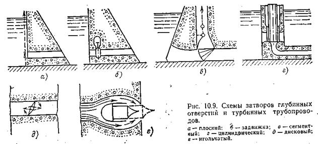 необходимости сброса излишней воды. Затвор вращается на оси, закрепленной в пороге плотины. Управление им обычно гидравлическое. Затворы удобны для сброса льда и плавающих тел с малыми потерями воды, могут перекрывать пролеты шириной до 60 м и высотой до 10 м. Водосбросные глубинные отверстия плотин перекрываются глубинными затворами, которые могут быть плоскими, сегментными, цилиндрическими, дисковыми и т. д. Первые два типа аналогичны описанным выше (рис. 10.9,а, в). Задвижки (рис. 10.9,6) имеют небольшие габариты и действуют от гидравлического или электрического привода. Конструктивно они представляют собой литые диски прямоугольной или круглой формы, которые перекрывают галереи или трубопроводы. Эти диски при открытии отверстия вдвигаются внутрь специального кожуха. Задвижки применяются в основном как рабочие затворы на напоры до 400 м. Их диаметр зависит от используемого напора и может достигать нескольких метров. Цилиндрические затворы. Конструктивно затворы представляют собой полые цилиндры, перемещающиеся по вертикали (рис. 10.9,г). Своей боковой поверхностью или днищем они закрывают отверстия башенных водоприемников. Из-за своей громоздкости они не получили заметного распространения, хотя и имеют хорошие эксплуатационные качества. Они используются для напоров, не превышающих 100 м. Дисковые затворы состоят из цилиндрического корпуса, в котором на горизонтальной или вертикальной оси вращается диск (рис. 10.9,д). Дисковые затворы надежны в эксплуатации, являются наиболее распространенными, изготовляются диаметром до 8,5 м и устанавливаются на напорных трубопроводах при напоре до 250—300 м (при небольших диаметрах до 600 м). Управление затвором осуществляется, как правило, с помощью гидравлического привода, приводимого в действие сервомоторами. Достоинством затворов являются хорошие маневренные качества и сравнительно низкая стоимость. Недостатком — сложность создания хороших уплотнений и сравнительно большая потеря напора. Игольчатые затворы состоят из корпуса и обтекателя, внутри которого перемешается плунжер (игла), закрывающий и открывающий отверстие в корпусе (рис. 10.9,е). Затворы имеют малые потери напора и применяются при диаметрах трубопровода до 6,5 м и напорах до 800 м. Устанавливают их главным образом с низовой стороны водоспуска. К недостаткам относят высокую стоимость, сложность конструкции и изготовления.