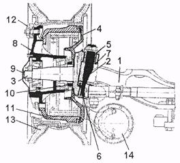 Назначение и устройство переднего моста. Передний (ведомый) мост: •воспринимает приходящуюся на него массу кузова, •обеспечивает изменение направления движения троллейбуса поворотом колес. Устройство переднего моста На балке моста - площадки для установки пневмоэлементов и рессор, а в середине кронштейн двуплечего рычага. Балка несущая, имеет двутавровое сечение. Кулаки имеют конические отверстии под шкворень. Шкворень плотно сидит в конусе кулака, а поворотные кулаки свободно вращаются во втулках вокруг шкворня, это обеспечивает поворот колес. Легкость обеспечивается упорным шариковым подшипником. Регулировочные шайбы дают возможность регулировать зазор между кулаком и вилкой поворотной цапфы. Ступица посажена на ось поворотной цапфы при помощи 2-х роликовых подшипников. Подшипники крепятся и регулируются гайкой, контргайкой, замковой шайбой. Для сохранения смазки и предотвращения ее вытекания из ступицы, с лобовой стороны она закрыта крынкой с прокладкой, а с внутренней стороны - сальником. К ступице крепится тормозной барабан и с помощью прижимов -бездисковое колесо. К суппорту крепится тормозной цилиндр, шарнирно - тормозные колодки, в суппорте - отверстие под ось разжимного кулака. Тяги рулевой трапеции шарнирно связаны с рычагами, закрепленными в конусных отверстиях в нижней части поворотных цапф. На правом переднем колесе установлен датчик спидометра, который закреплен на суппорте и изолирован от корпуса текстолитом.