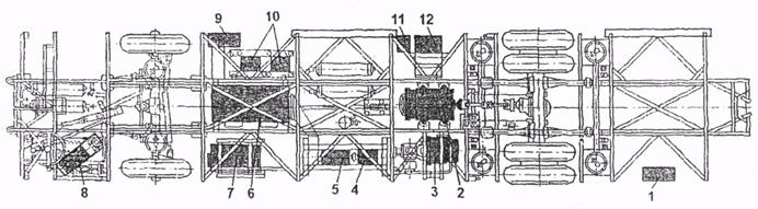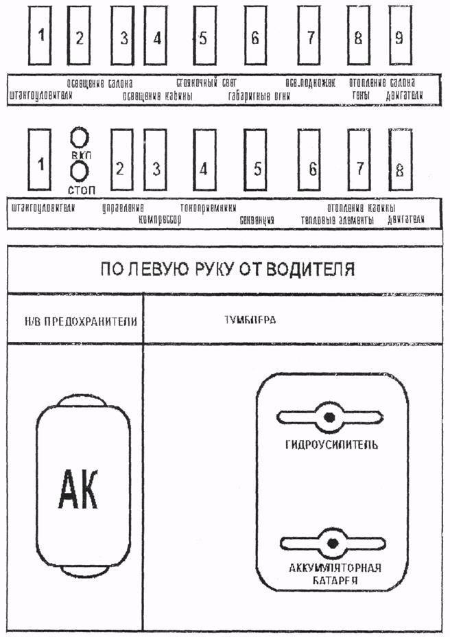 Рис.1 Расположение электрооборудования на шасси троллейбуса 1,9,11. Печь салона 7. Групповой реостатный 2. ТЭД контроллер 3. Двигатель компрессора 8. Двигатель насоса 4. Генератор гидроусилителя 5. Вспомогательный двигатель 10. Шунтовые сопротивления 6. Пуско-тормозные реостаты 12. Аккумуляторы В кабине водителя на пульте смонтированы основные приборы и аппараты для управления троллейбусом. Эти приборы, аппараты и переключатели показаны на рис. 2, 3, 4, 5 для троллейбусов нового образца, на рис. 6, 7, 8, 9, 10 для троллейбусов старого образца.