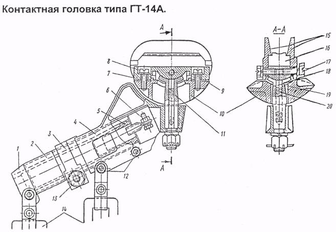 Рис.13. Контактная головка 1. Хомут 11.Пята 2.Резиновая втулка 12.Стяжной болт 3.Разрезная втулка 13.Стяжной болт 4.Держатель (башмак) Н.Пряжковые изоляторы 5.Изолятор 15.Латунные щечки 6.Клемма для провода 16.Контактная вставка 7.Вкладыш 17.Винт 8.Винт 18.Графитовая щетка 9.Прокладки 19.Пружина 10.Сферический держатель 20.Пружина Головка токоприемника крепится к штанге через изолятор, который представляет собой металлическую втулку. Втулка снаружи опрессована бумажно-бакелитовой изоляцией, а внутри находится резиновая изоляция. На втулке, в свою очередь, крепится стальной литой башмак 4. (рис.13). Подвижная часть головки через пяту 11 крепится к сферическому держателю 10, еще имеются вкладыш 7, латунные щеки 15 и контактная вставка 16. Для избежания падения контактной головки во время движения, предусмотрен башмакоуловитель. Он представляет собой ленту с двумя пряжковыми изоляторами 12. Токоприемник необходимо осматривать ежедневно перед выпуском на линию.