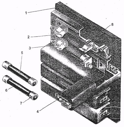 Предохранители используются для защиты от коротких замыкания и перегрузок, вспомогательных высоковольтных и низковольтных цепей. f Рис. 34. Блок предохранителей 1.Щиток 5.Предохранитель 2.Держатель б.Фибровая втулка 3.Контакт У.Латунный колпачок 4.Кожух 8.Узел крепления Высоковольтные предохранители собраны в отдельный блок, который установлен на перегородке за спиной водителя. Блок включает в себя цепи вспомогательного двигателя, двигателя компрессора, отопления салона и кабины. Предохранители имеют следующие уставки: ПП1 - 10 А, цепь ДВ ПП5 -20 А, обогрев салона ПП2 - 10 А, цепь ДК ПП6 -35 А, общий ППЗ - 8 А, обогрев кабины Устройство предохранителя закрытого типа показано на рис.34.