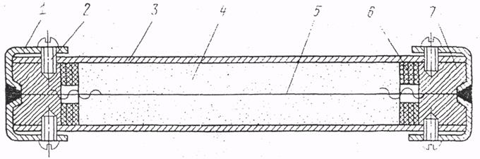 Рис.34г Устройство предохранителя закрытого типа 1. Латунный колпачок-• 5. Плавкая вставка 2. Винт 6. Асбестовые шайбы 3. Фибровая втулка.. 7. Асбестовая вата 4. Засыпка (песок, крошка- При установке предохранителя его крышки 1 надежно входят в пружинные контактные зажимы, закрепленные на щитке. Нормальный ток, на который рассчитан предохранитель, указана на крышке. Такой ток предохранитель.м%жёт выдерживать в течение длительного времени. В случае увеличения тока свыше допустимого, вставка нагревается и перегорает. В- результате цепь разрывается и прохождение тока прекращается. Низковольтные предохранители расположены в щитке в кабине водителя и рядом с дверными приводами.