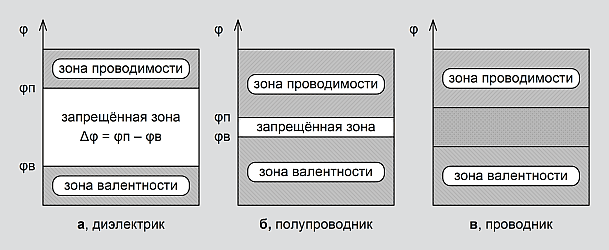 На данной зонной диаграмме изображение над буквой (а) соответствует диэлектрикам, над буквой (б) – полупроводникам, а над буквой (в) – проводникам. По вертикальной оси отложена энергия электронов, а горизонтальная ось безразмерна. Между зонами проводимости и валентности диэлектриков большой незаполненный промежуток, и упорядоченное движение носителей заряда отсутствует. Между энергетическими зонами проводимости и валентности полупроводников расстояние не велико, и в зоне валентности допустимо появление дырок, а в зоне проводимости такого же числа электронов, что может обеспечить условия протекания тока. Между зонами проводимости и валентности расположена запрещённая зона. Энергетические зоны валентности и проводимости металлов взаимно перекрываются. В результате передача даже незначительной энергии способна привести к протеканию тока.