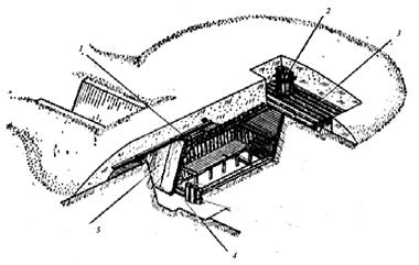 Рис. 2.9. Бліндаж безврубної конструкції з лісоматеріалів на відділення (обслугу): 1 – перекрита ділянка траншеї; 2 –вентиляційний короб; 3 – накат; 4 –дверний щит; 5 –герметизуюча завіса