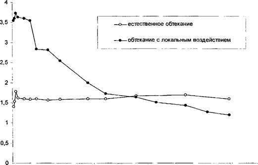 х/Ь б) кривые нарастания пульсаций. Рис. 5.7. Средняя скорость и амплитуда пульсаций, о - течение без локального воздействия, • - течение с локальным воздействием. переходе. В режиме обтекания с локальным воздействием после завершения перехода уровень пульсаций уменьшается вниз по потоку. Следует отметить, что в присоединенном режиме обтекания пик амплитуды пульсаций приходится над областью отрывного пузыря, существование которого было подтверждено визуализацией и измерениями статического давления на поверхности модели крыла — «полочка» на графике при х/Тг=0,1 (рис. 5.8). Эти измерения показали существенную разницу между уровнем разрежения над верхней поверхностью крыла потока при двух режимах обтекания. Данный метод воздействия изменяет обтекание крыла и, возможно, позволит улучшить его аэродинамические характеристики. Таким образом, найден новый способ управления обтеканием. Применение этого метода для повышения несущих свойств крыла будет целью дальнейших исследований.