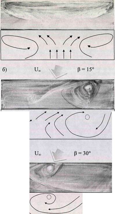 x/h=0.057 _i____ i__._ i____ 1 1 6 10 12 14 16 18 f, кГц б) течение с локальным воздействием. Рис. 5.9. Частотный состав пульсаций в пограничном слое вдоль хорды крыла. 5.4. Выводы к главе V. 1. Представлены результаты экспериментальных исследований обтекания модели прямого крыла, установленной под постоянным углом атаки, в режиме обтекания, при котором на поверхности крыла возникает срыв потока вблизи передней кромки или, при локальном воздействии, присоединенное течение с ламинарно-турбулентным переходом вблизи передней кромки крыла. 2. Установлено, что точечное локальное воздействие внутри области срыва позволяет преобразовать течение из срывного в присоединенное. 3. Получены данные визуализации и термоанемометрические измерения скорости и амплитуды пульсаций в обоих вариантах обтекания. 4. Найдено, что в результате искусственного присоединения значительно изменяется частота волны, развивающейся при переходе. Таким образом показано, что эта частота зависит не от частотного состава пульсаций в набегающем потоке, а от параметров пограничного слоя на поверхности крыла. Показано, что в обоих случаях развивается субгармоника основной волны, и её амплитуда становится больше амплитуды основной волны. 5. Обнаружен эффект увеличения амплитуды пульсаций вдоль хорды в срывном течении после ламинарно-турбулентного перехода за счет роста низко-частотных колебаний. Глава VI. ИЗУЧЕНИЕ ВОЗМОЖНОСТЕЙ УПРАВЛЕНИЯ ОТРЫВОМ С ПОМОЩЬЮ ЛОКАЛЬНОГО ВОЗДЕЙСТВИЯ ПРИ РАЗЛИЧНЫХ УГЛАХ СКОЛЬЖЕНИЯ. Описанные выше эксперименты оставили открытым вопрос о возможности управления обтеканием крыла, установленном на разных углах скольжения, при срыве потока. Для решения этого вопроса были проведены экспериментальные исследования, описанные в данной главе. В качестве локального воздействия применялись выступы различной формы. Эта серия экспериментов также имела поисковый характер. Новизна работы заключалась в том, что локальное воздействие производилось за линией глобального отрыва вниз по потоку при разных углах скольжения крыла. 6.1. Условия проведения эксперимента. Эксперименты были проведены в дозвуковой аэродинамической трубе МТ-324 на модели крыла умеренного удлинения № 6. Модель помещалась в рабочую часть и жестко закреплялась с помощью специального кронштейна к нижней поверхности рабочей части. Крепления крыла, кронштейн имели удобообтекаемый профиль и на поток существенного влияния не оказывали. Проводилось несколько серий экспериментов при разных углах скольжения крыла в срывном режиме обтекания с локальным воздействием и без него. Скорость набегающего потока оставалась постоянной и не изменялась в течение исследований. В качестве локального воздействия применялись выступы в форме конуса и ребра. Эти выступы устанавливались за линией отрыва вниз по потоку в различных местах. Объектом исследований была структура течения до и после локального воздействия. Основными методами исследований картин течения была саже- масляная визуализация. 6.2. Трансформация отрывной зоны с изменением угла скольжения. Первым этапом экспериментов стало изучение эволюции вихревых структур в области отрыва при изменении угла скольжения. Исследования были начаты с угла скольжения [3 = 0°. Срывной режим обтекания наблюдался при закритическом угле атаки а = 16° (рис. 6.1, а). Скорос