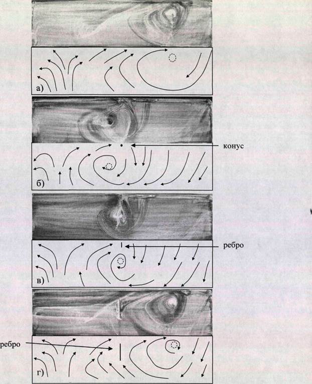 6.3. Влияние выступов на вихревую структуру обтекания. На втором этапе экспериментов изучалась возможность управления структурой вихревого течения с помощью конических выступов и ребер в зависимости угла скольжения, как и в экспериментах на первом этапе. На рис. 6.2 приведены картины визуализации на поверхности модели с локальным воздействием при нулевом угле скольжения. Угол атаки составлял а = 16°, и скорость набегающего потока была равна 25 м/с, значение которой в последующих экспериментах не менялось. Один конический выступ, установленный на 1/2 части размаха крыла, позволил присоединить поток на половине поверхности крыла и, тем самым, значительно уменьшил область срыва (рис. 6.2, б). Высота и диаметр основания конуса были равны 20 мм и 8 мм соответственно. Расстояние от передней кромки составляло 12 мм. Затем было установлено два идентичных выше описанному по размерам конуса на 1/3 и 2/3 части по размаху крыла и на расстоянии 12 мм от передней кромки. В результате локального воздействия срывная область значительно уменьшилась в размерах (рис. 6.2, в). Замена конусов на ребра дала тот же эффект в экспериментах описанных выше. Были получены идентичные картины течения. Длина одного ребра составляла 20 мм, высота- 4 мм и ширина- 3 мм. Расстояние от передней кромки до ребра было равно 4 мм. Ребра устанавливались в продольном направлении. При установке 5 ребер на 1/6, 1/3, 1/2, 2/3 и 5/6 части размаха крыла осталась только одна срывная область (рис. 6.2, г). Нужно отметить, что конусы выступали вверх из области отрыва, создавая тем самым турбулентный след, который мешал перетеканию потока из одной части крыла в другую, тем самым видоизменяя структуру обтекания в целом. Ребра, которые были полностью погружены внутрь отрывной области, мешали перетеканию вблизи передней кромки, что также видоизменяло структуру обтекания в целом. При угле скольжения р = 15° максимально удалось присоединить поток с помощью только одного конуса, расположенного на 1/2 части по размаху крыла. Расстояние от передней кромки равнялось 14 мм. Высота конуса составляла 15 мм, диаметр основания- 10 мм. На правой части крыла было безотрывное обтекание, на левой - возвратное течение (рис. 6.3, б). Крупномасштабный вихрь сместился в центральную часть. Ребро, установленное также на 1/2 части по размаху крыла, дало тот же эффект (рис. 6.3, в). Расстояние до передней кромки составляло 7 мм. Высота равнялась 4 мм и длина- 22 мм. Нужно отметить, что установка большого по размерам ребра, расположенного на 1/2 части размаха крыла, совсем не повлияла на вихревую структуру потока (рис. 6.3, г). Длина ребра составляла 73 мм и высота- 8 мм. Расстояние до передней кромки - 49 мм. Из этого следует, что влиять на структуру потока можно только вблизи передней кромки. Затем был увеличен угол стреловидности до (3 = 30° и угол атаки до а = 18°. Максимальный эффект от локального воздействия в виде ребра наблюдался на 1/4 и на 1/6 части размаха крыла (рис. 6.4, б и в). В первом случае отрывную область удалось значительно уменьшить в размерах. Во втором получилось полностью присоединенное течение. В обоих случаях расстояние от передней кромки составляло 6 мм. Длина ребра равнялась 20 мм и высота - 4 мм. Установка ребра на 1/2 части размаха крыла, также как при угле скольжения (3 = 15°, не повлияло на структуру обтекания (рис. 6.4, г). Расстояние до передней кромки было 