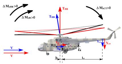 Фюзеляж вертолета способствует статической устойчивости по скорости, вследствие изменения силы лобового сопротивления. Однако на больших скоростях полета, дестабилизирующий момент силы лобового сопротивления фюзеляжа при увеличении скорости заметно возрастает и способствует неустойчивости вертолета. Стабилизатор способствует устойчивости вертолета по скорости с учетом того, что на моторных режимах полета его подъемная сила направлена вниз. Поэтому при увеличении скорости полета растет кабрирующий момент от стабилизатора, а при уменьшении – падает.