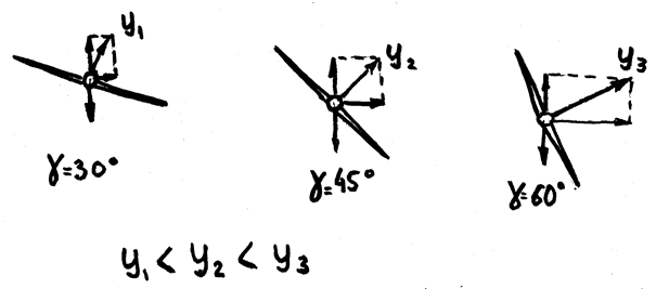 Вираж – это разворот в горизонтальной плоскости на 360о. Спираль — это тоже разворот, только с потерей или набором высоты. Вираж или разворот при помощи создания крена g (гамма) едва ли не самый важный и распространённый маневр ЛА. Каждый полёт, если это не подлёт по прямой, включает в себя выполнение разворотов. Поэтому очень важно понять физический смысл выполнения разворота. При выполнении разворота лётчик создает крен, несколько берет штурвал на себя, одновременно увеличивая тягу двигателя, и небольшим движением педалей несколько поворачивает руль направления в сторону разворота. Если полёт происходит на планере или на самолёте с задросселированным двигателем или выключенным двигателем, то вместо увеличения тяги лётчик несколько увеличивает угол планирования. Такой порядок действий у натренированного пилота отточен до автоматизма и не изменяется от типа ЛА, будь то планер или стратегический бомбардировщик Ту-160. Попробуем рассмотреть, почему происходит так, а не как-нибудь иначе. При создании крена g подъемная сила Y раскладывается на две составляющие Ycosg и Ysing, при этом первая Ycosg — должна компенсировать вес ЛА, а вторая Ysing — искривлять траекторию в горизонтальной плоскости. Для того, чтобы не допустить снижения ЛА, необходимо увеличить подъёмную силу Y настолько, чтобы составляющая Ycosg была равна весу. То есть при вводе в крен летчик несколько увеличивает угол атаки a, а для компенсации возросшего лобового сопротивления увеличивает тягу двигателя или увеличивает угол планирования. Рулём направления пилот компенсирует первоначальный момент скольжения при создании крена. При кажущейся простоте этот маневр таит в себе неприятные моменты, которые нужно знать и умело их обходить. Первое и самое главное. С увеличением угла крена необходимо увеличивать подъёмную силу, то есть перегрузку, а это ведет к резкому увеличению лобового сопротивления. Это самое лобовое сопротивление нужно компенсировать тягой двигателя или увеличением угла планирования. Например, при крене g=30о, перегрузка ny=1,15, при этом крене требуется сравнительно небольшое увеличение тяги или угла планирования. При g=45о ny=1,43 — это уже значительный прирост перегрузки, и он требует внушительного увеличения тяги. При g=60о ny=2 — это уже большой прирост перегрузки, и он требует увеличения тяги более, чем вдвое по сравнению с горизонтальным полётом, а при полёте на планировании перехода на пикирование с углом более 15о.