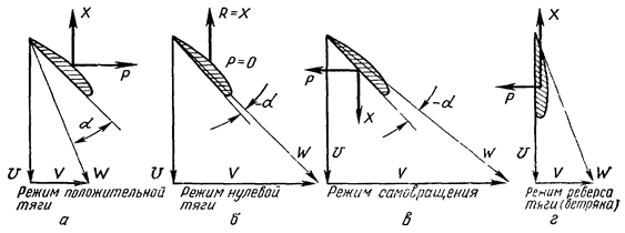 Рис. 8. Режимы работы воздушного винта Сила сопротивления вращению винта относительно его вращения создает момент сопротивления вращению винта, который уравновешивается крутящим моментом двигателя: Мтр=Хвrв (3.8) Крутящий момент, создаваемый двигателем, определяется (в кгс-м) по формуле где Ne -эффективная мощность двигателя. Рассмотренный режим называется режимом положительной тяги винта, так как эта тяга тянет самолет вперед (Рис. 8, а). При уменьшении угла атаки лопастей уменьшаются силы Р и Х (уменьшается тяга винта и тормозящий момент). Можно достичь такого режима, когда Р=0 и X=R. Это режим нулевой тяги (Рис. 8, б). При дальнейшем уменьшении угла атаки достигается режим, когда винт начнет вращаться не от двигателя, а от действия сил воздушного потока. Такой режим называется самовращением винта или авторотацией (Рис. 8, в). При дальнейшем уменьшении угла атаки элементов лопасти винта получим режим, на котором сила сопротивления лопасти винта Х будет направлена в сторону вращения винта, и при этом винт будет иметь отрицательную тягу. На этом режиме винт вращается от набегающего воздушного потока и вращает двигатель. Происходит раскрутка двигателя, этот режим называется режимом ветряка (Рис. 8, г). Режимы самовращения и ветряка возможны в горизонтальном полете и на пикировании. На самолетах Як-52 и Як-55 эти режимы проявляются при выполнении вертикальных фигур вниз на малом шаге лопасти винта. Поэтому рекомендуется при выполнении вертикальных фигур вниз (при разгоне скорости более 250 км/ч) винт затяжелять на 1/3 хода рычага управлением шага винта.