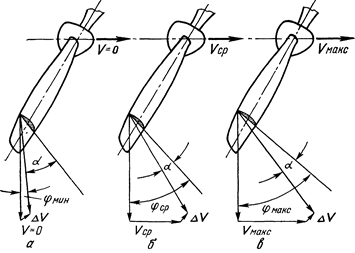 Рис. 14 Работа воздушного винта изменяемого шага В530ТА-Д35 при разных скоростях полета РПО совместно с механизмом поворота лопастей изменяет шаг винта (угол наклона лопастей) таким образом, чтобы обороты, заданные летчиком с помощью рычага управления ВИШ, при изменении режима полета оставались неизменными (заданными). При этом следует помнить, что обороты будут сохраняться до тех пор, пока эффективная мощность на валу двигателя Ne будет больше мощности, потребной для вращения воздушного винта при установке лопастей на самый малый угол наклона (малый шаг). На Рис. 14 показана схема работы ВИШ. При изменении скорости полета от взлетной до максимальной в горизонтальном полете угол установки лопастей j возрастает от своего минимального значения jмин до максимального jмакс (большой шаг). Благодаря этому углы атаки лопасти изменяются мало и сохраняются близкими к наивыгоднейшим. Работа ВИШ на взлете характерна тем, что на взлете используется вся мощность двигателя - развивается наибольшая тяга. Это возможно при условии, что двигатель развивает максимальные обороты, а каждая часть лопасти винта развивает наибольшую тягу, имея наименьшее сопротивление вращению. Для этого необходимо, чтобы каждый элемент лопасти воздушного винта работал на углах атаки, близких к критическому, но без срыва воздушного потока. На Рис. 14, а видно, что угол атаки лопасти перед взлетом (V=0) за счет перетекания воздуха со скоростью DV немного отличается от угла наклона лопасти на величину фмин. Угол атаки лопасти соответствует величине максимальной подъемной силы. Сопротивление вращению достигает в этом случае величины, при которой мощность, расходуемая на вращение винта, и эффективная мощность двигателя сравниваются и обороты будут неизменными. С увеличением скорости угол атаки лопастей воздушного винта уменьшается (Рис. 14, б). Уменьшается сопротивление вращению и воздушный винт как бы облегчается. Обороты двигателя должны возрастать, но РПО удерживает их за счет изменения угла атаки лопастей постоянными. По мере увеличения скорости полета лопасти разворачиваются на больший угол jср. При выполнении полета на максимальной скорости ВИШ также должен обеспечивать максимальное значение тяги. При полете на максимальной скорости угол наклона лопастей имеет предельное значение рмакс (Рис. 14, в). Следовательно, при изменении скорости полета происходит изменение угла атаки лопасти, при уменьшении скорости полета угол атаки увеличивается - винт затяжеляется, при увеличении скорости полета угол атаки уменьшается - винт облегчается. РПО автоматически переводит лопасти винта на соответствующие углы. При увеличении высоты полета мощность двигателя уменьшается и РПО уменьшает угол наклона лопастей, чтобы облегчить работу двигателя, и наоборот. Следовательно, РПО удерживает обороты двигателя с изменением высоты полета постоянными. При заходе на посадку воздушный винт устанавливается на малый шаг, что соответствует оборотам взлетного режима. Это дает возможность летчику при выполнении всевозможных маневров на глиссаде посадки получить взлетную мощность двигателя при увеличении оборотов до максимальных.