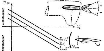 Рис. 8 График тz = f (СуП,) для перевернутого полета На устойчивом в продольном отношении самолете в перевернутом полете должны сохраняться те же условия равновесия, что и в нормальном полете. Положение фокуса профилей крыла современных самолетов в перевернутом полете в летном диапазоне углов атаки практически остается без изменения. Однако фокус самолета в целом у некоторых самолетов в перевернутом полете может быть смещен назад за счет угла установки стабилизатора, рассчитанного на нормальный полет. Кроме того, в перевернутом полете уменьшается величина mZ0 (момент самолета при Су = 0) вследствие изменения скоса потока в районе горизонтального оперения, наличия угла установки стабилизатора и ряда других факторов. Все это приводит к тому, что в перевернутом полете продольная устойчивость несколько отличается от продольной устойчивости в нормальном полете. На Рис. 8 показан график изменения коэффициента продольного момента самолета тгс в перевернутом полете в зависимости от изменения коэффициента подъемной силы (СуП) и от положения руля высоты. Поперечная устойчивость - это способность самолета самостоятельно, без вмешательства летчика, устранять возникший крен. У самолетов, имеющих прямое (не стреловидное) крыло, для улучшения поперечной устойчивости в нормальном полете крылу придают положительный угол поперечного V. При полете в перевернутом положении (на спине) поперечная устойчивость у таких самолетов ухудшается. Такое ухудшение поперечной устойчивости наблюдается, например, у самолета Як-18П, имеющего положительный угол поперечного V крыла, равный +7° 30'. Если самолет летит без скольжения, то при возникновении крена, вследствие увеличения угла атаки у опускающегося крыла и уменьшения у поднимающегося, центр давления сместится в сторону опускающегося крыла. Появляется момент относительно продольной оси, направленный на устранение возникающего крена. Возникновению крена препятствует также момент поперечного демпфирования крыла. Однако при наличии скольжения, которое при образовании крена вызывается составляющей веса Gz, возникает составляющая скорости, направленная вдоль крыла. При наличии положительного поперечного V крыла, которое в перевернутом положении фактически становится отрицательным, угол атаки крыла, на которое происходит скольжение, уменьшается, а у противоположного - увеличивается