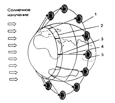 Рис.14. Спутниковая система восстановления озонового слоя Земли: 1 – солнечносинхронная орбита; 2 – наработанный слой озона; 3 – след луча в атмосфере; 4 – лазерный луч; 5 – космический аппарат-генератор Приложение 3