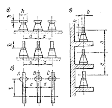 Рис. 7-13. Способы расположения многополосных шин На рис. 7-12 и 7-13 показаны различные способы расположения однополосных и многополосных шин прямоугольного и коробчатого сечения. Горизонтальное расположение полос или пакетов шин выгоднее с механической точки зрения, так как шины, обращенные друг к другу узкой стороной, имеют на 40 % больший момент сопротивления относительно оси, перпендикулярной электродинамическим силам при к. з., чем шины при вертикальной установке. Следовательно, в соответствии с формулой, определяющей механические напряжения (в паскалях) в материале шин при к. з., qрасч = FPI(10W), (7-35) где F — максимальное усилие, приходящееся на 1 см длины шины, от взаимодействия токов в фазах, Н/м; I — расстояние (пролет) между осями опорных изоляторов вдоль фазы, м (рис. 7-14); W — момент сопротивления шины относительно оси, перпендикулярной усилию, м3; эти напряжения меньше, чем при вертикальном расположении. Рис. 7-14. Установка прокладок у двухполосной шины Однако условия охлаждения шин при установке их на плоскость хуже, и нагрузка шин при таком расположении должна быть уменьшена на 5—8 %. Сечение плоских шин выбирают по экономической плотности тока /эк — в А/мм2 [72] (табл. 7-7), деля рабочий ток нормального режима на экономическую плотность: (7-36) Полученное таким образом сечение, при котором ежегодные расчетные затраты оказываются наименьшими, носит название экономического. Так как сечения шин стандартизированы и сведены в таблицы [72], то при выборе их достаточно определить экономическое сечение по (7-36) и затем округлить его до ближайшего табличного значения. Проверка шин на динамическую стойкость при к. з. заключается в сопоставлении механических напряжений, возникающих в материале шин при к. з,, с допустимыми напряжениями (табл. 7-8). Максимальное расчетное напряжение в материале однополосной шины при к. з. определяется по формуле (7-35). При этом следует учитывать, что изгибающая сила F зависит от частоты собственных колебаний шинных конструкций и по условиям резонанса опасны частоты, близкие к 50 и 100 Гц. Таблица 7-7