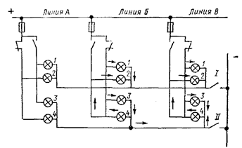 Кроме главных схем или схем первичных соединений, указывающих пути электроэнергии от источника питания к потребителю, существуют также схемы вторичных соединений, в которых с помощью условных графических изображений указаны элементы вторичных устройств и соединения между ними и элементами основного оборудования (измерительные трансформаторы, коммутационная аппаратура и др.). К вторичным устройствам относятся контрольно-измерительные приборы, аппараты релейной защиты и автоматики, аппаратура управления блокировок, аварийной и предупреждающей сигнализации. Надежность и экономичность электроустановок в значительной степени зависят как от вторичных устройств, так и от схем вторичных соединений и от выполнения их в натуре. По назначению схемы вторичных соединений могут быть: а) принципиальные, б) полные и в) монтажные. Принципиальные схемы составляются применительно к отдельным элементам: цепям релейной защиты, цепям управления и сигнализации, соединениям измерительных приборов. Эти схемы являются основой для составления полных схем, которые охватывают вторичные соединения, относящиеся к одному присоединению главной схемы, обособленному по функциональному, технологическому или структурному признаку (генератор, трансформатор, линия, механизм собственных нужд). Монтажные схемы служат рабочим чертежом, по которому производится монтаж вторичных цепей. В монтажных схемах показывается не только каким образом, но и какими средствами будут осуществлены в действительности электрические связи (сечение и тип контрольных кабелей, сборки зажимов, испытательные блоки). Монтажные чертежа учитывают территориальную разбросанность оборудования, относящегося ко вторичным цепям (щиты управления, щиты релейные и автоматики, ячейки РУ). Характер и форма исполнения чертежей должны соответствовать порядку производства монтажных работ. После внесения изменений и дополнений, неизбежно появляющихся в процессе монтажа, составляются исполнительные монтажные схемы, которые служат основным документом при эксплуатации установки. Принципиальные и полные схемы могут быть свернутыми и развернутыми. В свернутых схемах все приборы и аппараты изображаются в собранном виде со всеми относящимися к ним катушками и контактами. Рис. 8-1. Принципиальная схема релейной защиты кабельной линии: а — в свернутом виде; б — в развернутом виде В — выключатель; ТТ — трансформатор тока; К О — катушка отключения; Л К — сигнальная (контрольная) лампа; Rд — добавочное сопротивление; РТ — реле тока; РВ — реле времени; РУ — реле указательное; ИП — измерительный прибор; ШУ — шинка управления; ШС — шинка сигнализации; ШМ — шинка мигания При значительном числе участвующих в схеме элементов свернутые схемы неудобочитаемы. В них затруднена проверка правильности электрических соединений на чертеже и в натуре. В развернутых схемах, которые в настоящее время получили исключительное применение, аппараты и приборы расчленяются на составные элементы. Эти элементы соединяются между собой в порядке протекания тока по схеме, например от полюса к полюсу (+, —), от фазы к фазе, от фазы к нулю. Развернутая схема может быть сориентирована: а) слева направо с расположением строчек (читаемых сверху вниз) по вертикали; б) сверху вниз с расположением строчек (читаемых слева нап