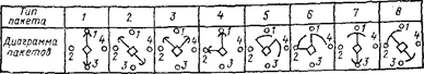 Рис, 8-12. Диаграмма пакетов переключателя ПМО проверки релейных защит, световой и звуковой сигнализации. В зависимости от назначения эта аппаратура делится на группы: аппараты управления, служащие для подачи команд на включение и отключение, переключение блокировок, изменение программ; релейная аппаратура цепей управления для усиления командных импульсов, выполнения логических программ, контроля цепей; сигнальная аппаратура — лампы, табло, звонки, сирены; измерительные приборы — указатели положения, амперметры, вольтметры, ваттметры; аппаратура электрической и технологической защиты двигателей и механизмов вторичных цепей. На электрических станциях и подстанциях широко распространены универсальные пакетные ключи-контакторы завода «Электропульт» типа КФ (с фиксатором), КВ (с возвратным механизмом), КВФ (с возвратным механизмом и фиксатором), КСВФ (со светящейся рукояткой, возвратным механизмом и фиксатором) и их модификации 54 КВ, 54 КФ, 54 КВФ. Необходимость размещения на блочных щитах управления современных блочных электростанций многих тысяч реле, переключателей, кнопок, табло привела к миниатюризации всей этой аппаратуры. Особенно важны небольшие размеры аппаратов, размещаемых на пультах управления. Поэтому в последнее время осуществлен широкий переход на низковольтную аппаратуру (до 60 В), а завод «Электропульт» заменил пакетные ключи серии К новыми переключателями серий ПМО и МК, имеющими значительно меньшие габариты. Универсальные пакетные ключи старого типа серии К и новые малогабаритные переключатели ПМО и МК служат основными управляющими органами в схемах управления. Они состоят из набора контактных пакетов (до шести в одном переключателе), в каждом из которых имеются четыре неподвижных и один подвижный контакт. Подвижные контакты всех пакетов укреплены на центральном вращающемся валике, соединенном с рукояткой переключателя. Сочетание различных типов контактов, их расположение на валике и характер движения и фиксации валика обеспечивают желательный порядок соединения неподвижных контактов. Ключи КФ, ПМОФ и МКФ с различным набором пакетов и схем исполнения и с фиксированными положениями подвижных контактов через 45 или 90° служат как вольтметровые переключатели, переключатели для активно-реактивного ваттметра, для синхронизаторов, для устройств контроля изоляции. Ключи КВФ и КСВФ и переключатели ПМОВФ и МКВФ с самовозвратом подвижных контактов из двух оперативных положений (4-5 и 135°) в сигнальные и с фиксацией рукоятки в двух сигнальных положениях под углом 90° друг к другу применяются в основном для цепей управления и сигнализации основных агрегатов и линий электрических станций и подстанций. На рис. 8-12 показаны основные типы подвижных контактов ключа ПМО.