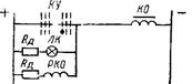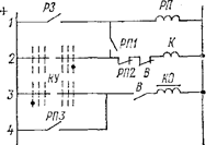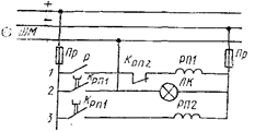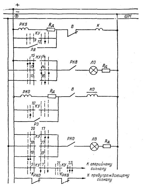 Рис. 8-17. Схема «пульс-пара» Р — рубильник Рис. 8-18. Схема управления и сигнализации выключателем с звуковым контролем цепей управления 1, 2, 23 — номера контактов ключа КУ; РКВ — реле контроля включения; ЛB — сигнальная лампа включения; ЛО — сигнальная лампа отключения