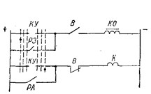 Рис. 8-14. Схема размыкания цепи отключения с помощью вспомогательных контактов привода выключателя В — вспомогательный контакт выключателя; РЗ - реле защиты; РА — реле автоматики; К — контактор Рис. 8-15. Схема блокировки от «прыгания» К — контактор Контроль исправности цепи управления может быть осуществлен путем включения сигнальной лампы (ЛК) параллельно контактам ключа управления (рис. 8-13). Конечно, обходная цепь в схеме на рис. 8-13 должна быть выполнена таким образом, чтобы при прохождении тока через лампу или катушку реле было невозможно ложное включение или отключение. Для этого цепь лампы или реле регулируется на потребление тока, равного примерно 10—15 % номинального тока катушек включения и отключения; для защиты от ложной работы при коротком замыкании в самой лампе или при перегорании катушки реле последовательно с ними устанавливается добавочное сопротивление Rn. Так как время, необходимое для включения или отключения, составляет доли секунды, рассчитывать катушки привода и катушку включения на длительную работу нет необходимости; рассчитанные на кратковременную работу катушки при длительном протекании по ним тока неминуемо сгорят. Это следует учесть при выборе предохранителей в цепи катушки включения, принимая при этом во внимание тепловую инерцию предохранителей. Поэтому цепь включения или отключения по завершении операции должна быть разорвана с помощью вспомогательных контактов привода выключателя (рис. 8-14). Вспомогательные контакты выключателя должны быть отрегулированы так, чтобы не обгорали контакты реле или ключа управления при отключении цепи с большой индуктивностью, т. е. они должны размыкаться несколько раньше контактов реле или ключа. При отсутствии встроенной в привод механической или электромеханической блокировки от «прыгания», т. е. многократного повторного включения, следует предусмотреть электрическую блокировку, препятствующую повторным включениям линии в случае включения ее на неустраненное повреждение (рис. 8-15). Рис. 8-16, Схема "несоответствия" ШЗА — шинка звуковой аварийной сигнализации; Зв — звуковой сигнал (сирена) Как следует из рис. 8-15, при действии релейной защиты РЗ и нахождении КУ в положении «Включено» повторного включения не происходит; этому мешают замыкающие контакты РП1 и РПЗ промежуточного реле РП и разомкнутый в этот момент размыкающий контакт реле РП2. Пока ключ управления стоит в положении «Включено», промежуточное реле РП оживлено током через контакты РП 1; в то же время обтекается током через контакты РПЗ и отключающая катушка КО. В схеме управления следует предусмотреть соответствующие сигнализации о ненормальном и аварийном состоянии, в частности схему аварийного отключения. Выполняется такая схема по принципу несоответствия: в цепь обычного звукового сигнала вводят размыкающие вспомогательные контакты привода выключателя и контакты ключа управления, находящиеся в положении «Включено» (рис. 8-16). Для того чтобы обратить внимание оператора на ненормальное или аварийное состояние, а также ради уменьшения числа контрольных ламп часто прибегают к мигающему свету ламп. Ранее для этой дели применяли специальные машинные прерыватели, а в настоящее время используют прерыватели тиристорного типа или схему «пульс-пара» (рис. 8-17). Здесь применены реле РП1 с замыка