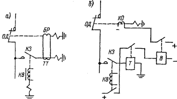 Рис. 8-36. Схема объединения операций управления ОД и КЗ: а — на переменном токе; б — на постоянном токе БР - реле блокировки Немаловажной причиной появления таких схем была, помимо высокой стоимости, громоздкости, дефицитности выключателей высокого напряжения, еще и не удовлетворяющая потребителей надежность работы. Применение упрощенных схем может быть целесообразно и при параллельной работе на одного потребителя группы высоковольтных трансформаторов (например, выпрямительных агрегатов, работающих на одну серию электролиза); в этом случае устанавливается один или два групповых выключателя, а на отдельных ответвлениях — короткозамыкатели и отделители. При аварии на одном из ответвлений, конечно, отключится вся группа, но затем быстро (в бестоковую паузу) питание всех неповрежденных ответвлений восстанавливается. КЗ служит для искусственного короткого замыкания, вызывающего срабатывание выключателя в начале линии, а отделитель — для отсоединения поврежденного ответвления в бестоковую паузу. Короткозамыкатели снабжаются ручным автоматическим приводом типа ШПК и пружинным механизмом для включения ножа разъединителя. Привод ШПК имеет два отключающих электромагнита, реле прямого мгновенного действия, являющееся элементом релейной защиты (токовой, дифференциальной, газовой и др.), и один электромагнит включения (КВ), питающийся от независимого источника (оперативного постоянного тока, оперативного переменного тока). При втягивании сердечника одного из этих элементов освобождается защелка, короткозамыкатель включается под действием пружинного механизма (за время 0,4—0,5 с). Дуга при включении может привести к оплавлению и свариванию контактов, к повреждению фарфоровых изоляторов, поэтому после включения необходим и осмотр и ремонт. В связи с этим отключение короткозамыкателя производится вручную съемной рукояткой, одновременно при отключении заводятся и включающие пружины. Отделитель предназначен для отключения поврежденной части установки после отключения короткого замыкания групповым линейным выключателем. Для спаривания работы короткозамыкателя и отделителя у первого за ножом устанавливается трансформатор тока (ТШЛ-0,5;, во вторичную обмотку которого включается специальное блокирующее реле отделителя, препятствующее отключению последнего при не отключенном еще токе короткого замыкания. Кстати, отделитель кроме блокировочного реле имеет и электромагнит дистанционного отключения. Как и короткозамыкатели, отделители имеют специальные пружинные устройства. У отделителей могут быть применены приводы ШПО, при которых включение ОД производится только вручную, и ШППО, допускающий и автоматическое включение и отключение. Рис. 8-37, Схема защиты трансформатора с блокировкой С — конденсатор; Д — выпрямитель; РГ — газовое реле; УЗ — зарядное устройство Отключающие пружины при включении ОД удерживаются в напряженном состоянии запирающей защелкой. При срабатывании КЗ и обтекании блокирующего реле током от трансформатора тока короткозамыкателя сердечник реле подтягивается и заводит пружину, которая в бестоковую паузу производит расцепление защелки, и ОД отключается пружиной. Привод ШППО имеет дополнительные элементы для автоматического включения ОД: включающую пружину, электромагнит включения и элек