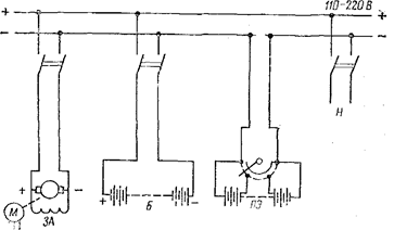 Рис. 9-5. Схема аккумуляторной установки с противоэлементами. ПЭ — противоэлементы; Н — нагрузка Существует также схема аккумуляторной установки, в которой часть нагрузки, нуждающаяся в регулировании напряжения, подключается к батарее через группу электролитических элементов, состоящих из стальных пластин, погруженных в раствор щелочи (едкого кали или натра). При прохождении тока через эти так называемые противоэлементы в них возникает реакция электролиза щелочного раствора, сопровождающаяся поглощением энергии и падением напряжения, не зависящим от тока. Таким образом, изменяя число включенных противозлементов, можно понижать напряжение на регулируемых шинах до нужного уровня (рис. 9-5). Достоинствами схемы с противоэлементами являются отсутствие элементного коммутатора, уменьшение износа и увеличение срока службы основных аккумуляторов. Схема с противоэлементами известна давно, но широкого распространения не получила, по-видимому, из-за некоторой громоздкости и усложнения эксплуатации.