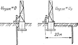 Рис. 12-3. Изменение потенциала при растекании тока в однородном грунте Рис. 12-4. Заземление опор с граничными напряжениями прикосновения