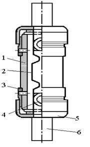 Рис. 3.11. Предохранитель серии ПР: а - разрез; б - ампер-секундная характеристика; 1 - фибровая трубка; 2 - плавкая вставка; 3 - латунная втулка; 4 - болтовой контакт ножа с плавкой вставкой; 5 - латунный колпачок; 6 - медный контактный нож