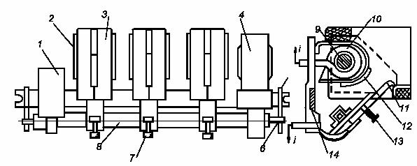 Главные контакты контактора КМ включены в цепь двигателя М, а катушка - в цепь управления последовательно с кнопками управления SB 1, SB 2 и вспомогательными контактами SQ. На конструктивной схеме (рис. 3.13, б) контактор изображен в момент отключения, когда напряжение с катушки 15, установленной на сердечнике 14, снято и подвижная система под действием пружины 11 пришла в нормальное положение. Дуга, возникшая между контактами 2 и 7, гасится в камере 5 с изоляционными перегородками 4. Втягивание дуги в камеру происходит за счет магнитного поля, созданного магнитной системой, состоящей из катушки 16, включенной последовательно в главную цепь, стального сердечника 1 и полюсных наконечников 17. На выходе из камеры установлена пламягасительная решетка 3, препятствующая выходу ионизированных газов за пределы камеры. Управление контактором может осуществляться с помощью кнопок, рубильников, реле, ключей управления. Для включения контактора подается напряжение на зажимы катушки 13 путем нажатия кнопки SB 1. В катушке создается магнитный поток, притягивающий якорь 10 к сердечнику. На якоре укреплен подвижный контакт 7, который после соприкосновения с неподвижным контактом 2 скользит по его поверхности, разрушая пленку окислов на поверхности контактов. Нажатие в контактах создается пружиной 8. Контактные накладки 6 из серебра обеспечивают минимальное переходное сопротивление. В некоторых случаях накладки выполняются из дугостойкой металлокерамики. Контактор удерживается во включенном положении своей катушкой. После включения контактора замыкаются вспомогательные контакты 12 (SQ), шунтирующие кнопку SB1, поэтому размыкание пусковой кнопки не разрывает цепь катушки 15 (КМ). На якоре 10 предусмотрена немагнитная прокладка из латуни 9, которая уменьшает силу притяжения, обусловленную остаточной индукцией в сердечнике. Таким образом, при снятии напряжения с катушки 15 якорь не «залипает». При значительном снижении напряжения в цепи управления, а также при его исчезновении контактор автоматически отключается. Для отключения контактора достаточно нажать на кнопку SB 2, которая разомкнет цепь питания катушки 15. Защита электродвигателя в рассмотренной схеме осуществляется автоматическим выключателем QF. К электромагнитным контакторам общепромышленных серий относятся следующие типы: переменного тока КТ, КТП, КТВ; постоянного тока КП, КПВ, КПД; постоянного и переменного тока КМ, РПК, КН. Широко применяется контактор поворотного типа серии КТ6000 с щелевыми камерами и магнитным дутьем и КТ7000 с дугогасительными решетками для тяжелых режимов работы в цепях переменного тока (категории АС-З, АС-4). На рис. 3.14 показана конструктивная схема контактора КТ6000. На металлической рейке 14 крепятся узлы неподвижных контактов 12 вместе с системами магнитного дутья - катушкой 10, сердечником 9, боковыми стальными пластинами 2 и дугогасительными камерами 3. На рейке 14 установлен сердечник электромагнита, неподвижная часть вспомогательных контактов 1 и крепятся опоры подшипников 5 для главного вала 6. Наружная часть вала 8 изолирована, на нем установлены подвижные контакты 11 с контактными пружинами 13 и гибкими связями 7 (три полюса), подвижная часть вспомогательных контактов 1 и якорь электромагнита 4. Работа контактора происходит так, как было описано выше. Контакторы этой серии 