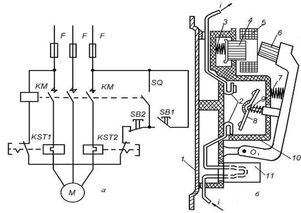 При нажатии кнопки SB1 подается питание в катушку контактора КМ(5) через размыкающиеся контакты тепловых реле KST1, KST2 и кнопку SB 2. Якорь электромагнита 6 притягивается к сердечнику 4, вращаясь вокруг оси O 1. При этом неподвижные контакты 2 замыкаются подвижным контактным мостиком 8. Нажатие в контактах обеспечивается пружиной 9. Одновременно замыкаются вспомогательные контакты SQ (рис. 3.15, а), которые шунтируют кнопку SB 1. При перегрузке электродвигателя срабатывают оба или одно тепловое реле 11, цепь катушки размыкается контактами KST1 и KST2. При этом якорь 6 больше не удерживается сердечником и под действием собственной массы и пружины 7 подвижная система переходит в отключенное положение, размыкая контакты. Двукратный разрыв в каждой фазе и закрытая камера 10 обеспечивают гашение дуги без специальных устройств. Точно так же происходит отключение пускателя при нажатии кнопки SB 2. Амортизирующая пружина 3 предохраняет подвижную часть от резких ударов при включении. Все детали пускателя крепятся на металлическом основании 1. Для защиты электродвигателя от КЗ в цепь включены предохранители (F). Магнитный пускатель защищает двигатель от перегрузки с помощью тепловых реле и отключает его при снижении напряжений до 50¾60 % U н. При перегрузке электродвигателя элементы тепловых реле нагревают биметаллическую пластину, изготовленную из сплавов, имеющих разные коэффициенты линейного расширения, которые при нагрузке изгибаются и размыкают цепь катушки. Магнитные пускатели не предназначены для разрыва цепи при коротком замыкании, поэтому последовательно с ними устанавливаются предохранители. Наиболее распространенными сериями являются ПМБ, ПМА, ПА. Пускатели могут быть реверсивными и нереверсивными, в открытом, защищенном и пылебрызгонепроницаемом исполнении, с тепловыми реле и без них. Магнитные пускатели применяются для управления электродвигателями переменного тока напряжением до 660 В, мощностью до 75 кВт.