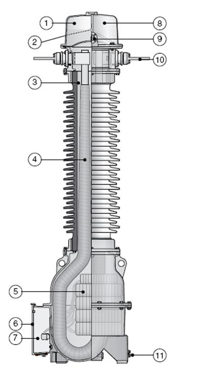 . Рис. 3.35. Маломасляные измерительные трансформаторы тока типа IMB (ABB): 1 - газовая подушка; 2 - крышка отверстия для заливки масла (не показано); 3 - кварцевый песок; 4 - токопровод с бумажной изоляцией; 5 - сердечники/вторичные обмотки; 6 - коробка вторичных выводов; 7 - емкостной вывод (поставляется под заказ); 8 - расширительная система; 9 - указатель уровня масла; 10 - вывод первичной обмотки; 11 - заземляющий вывод