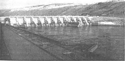 Fig. 4. Rocky Reach Hydroelectric Project Large dams and reservoirs can have other impacts on a watershed. Damming a river can alter the amount and quality of water in the river downstream of the dam, as well as preventing fish from migrating upstream to spawn. These impacts can be reduced by requiring minimum flows downstream of a dam, and by creating fish ladders which allow fish to move upstream past the dam. Silt, normally carried downstream to the lower reaches of a river, is trapped by a dam and deposited on me bed of the reservoir. This silt can slowly fill up a reservoir, decreasing ne arnount of water which can be stored and used for electrical genera-ton. The river downstream of the dam is also deprived of silt which fer- zes tne river's flood-plain during high water periods. Section I. Power Unit 5. Hydropower. Impacts 35